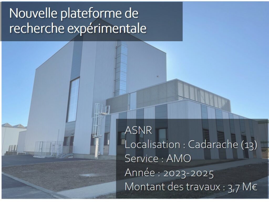 Institut public de recherche et d’expertise sur les risques nucléaires et radiologiques Construction d’une plateforme de recherche Le projet Construction d’une nouvelle plateforme de recherche expérimentale sur le site du CEA Cadarache. 2023-2025 3,7 M€ AMO Cadarache (13) Retour réalisations